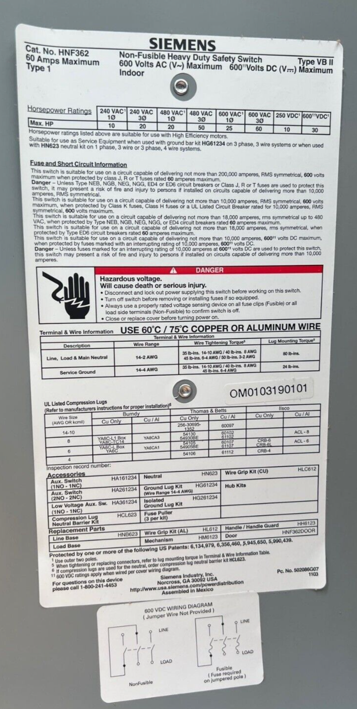 Siemens HNF362 Safety Disconnect Switch 60A 3P 600V Type 1 Indoor Enclosure