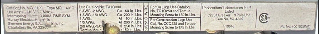 Siemens MQJ3100 100A 240V 3 Pole Circuit Breaker
