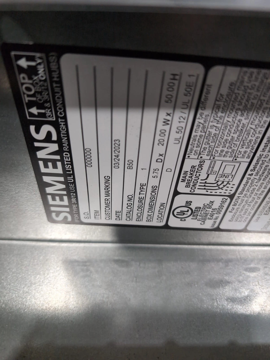 Siemens P1 Panelboard 250A 480/277V 3PH MLO Panel 250 Amp 54 Cir P1E54ML250ATST