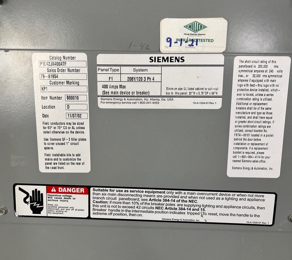Siemens P1C42JX400ATF P1 Panelboard 400A 208/120V 3PH 4W 42 CircuitMCB Indoor Encl B68
