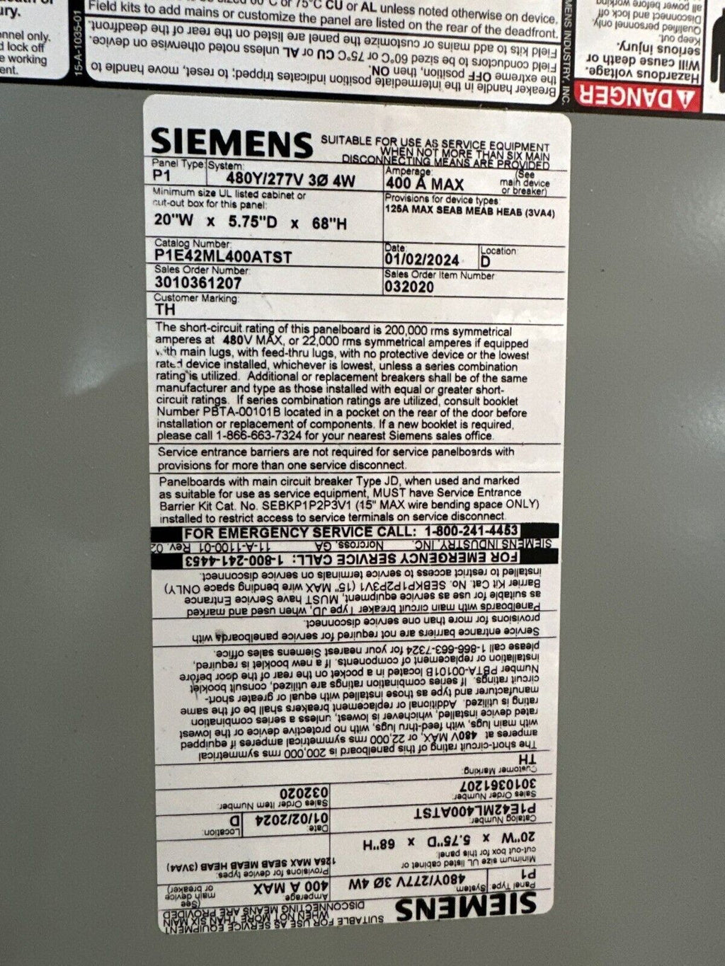 Siemens P1E42ML400ATST P1 Panelboard 400A 480/277V 3PH 4W Indoor Encl MLO 42 Circuit Box B68: 68" x 20" x 6" P518