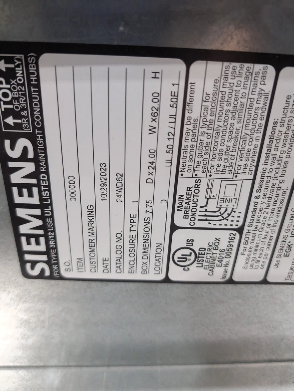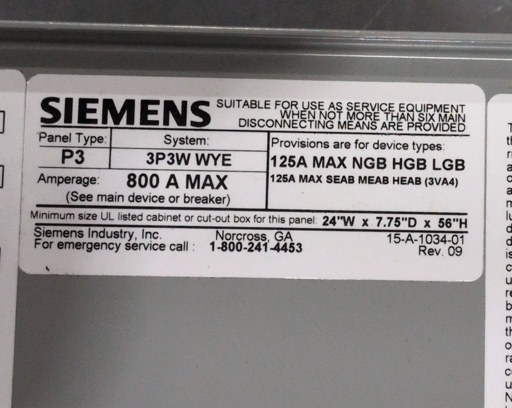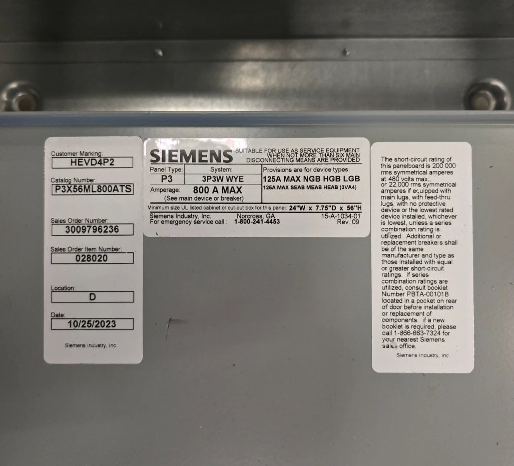 Siemens P3 Panelboard 800A 480V 3P 3W P3X56ML800ATS MLO Panel 800 Amp