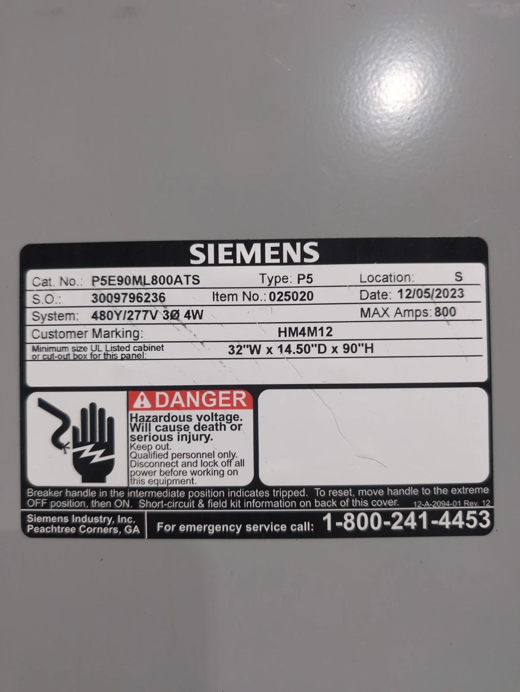 Siemens P5 Panelboard P5E90ML800ATS 800A 480/277V 3PH 4W MLO Panel 800 Amp Main Lug