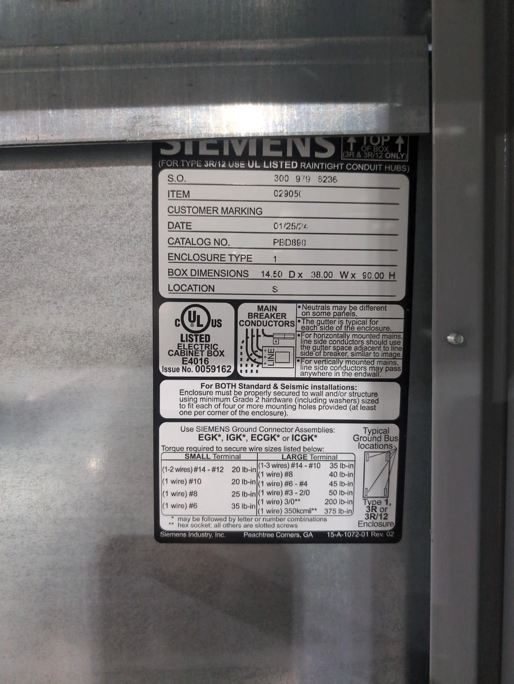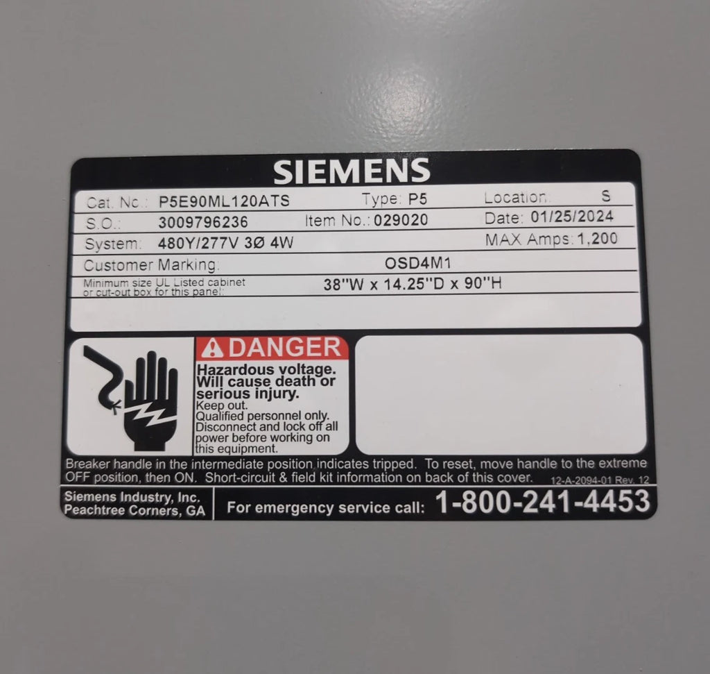 Siemens P5 Panelboard P5E90ML120ATS 1200A 480/277V 3PH 4W MLO Panel 1200 Amp Main Lug