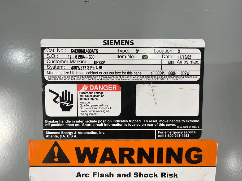 Siemens S4 S4E60ML400ATS Panelboard 400A 480/277V 3PH 4W MLO Indoor Encl B60 Used