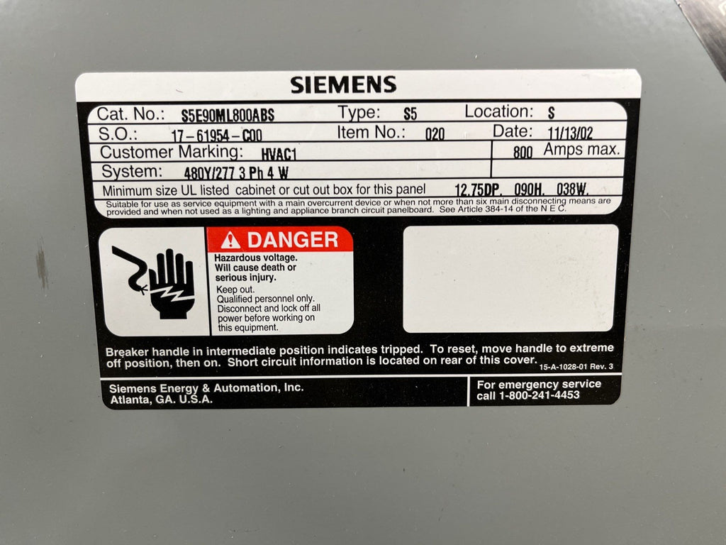 Siemens S5E90ML800ABS S5 Panelboard 800A 480/277V 3PH 4W MLO Indoor Encl B890 Box