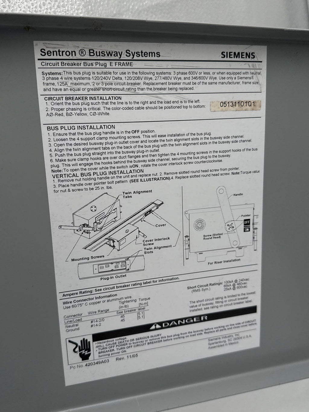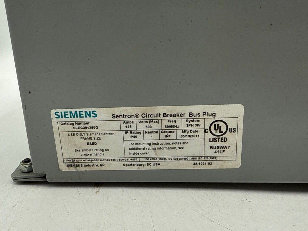 Siemens SLEC301250G Bus Plug 125A 3PH 3W 600V Sentron Circuit Breaker Bus Plug ED63B060Busway Switch