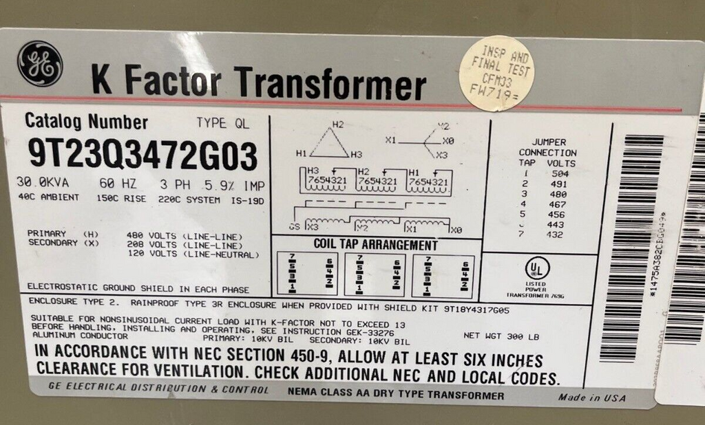 30 kVA GE 9T23Q3472G03 3PH Transformer Pri 480V Sec 208Y/120V 3 Phase Indoor