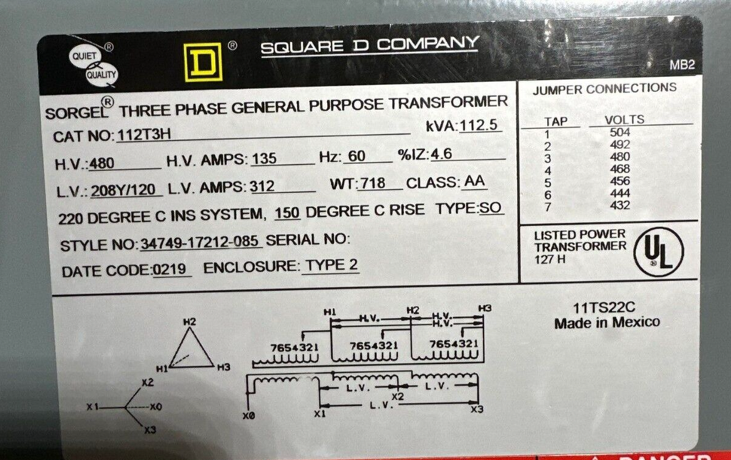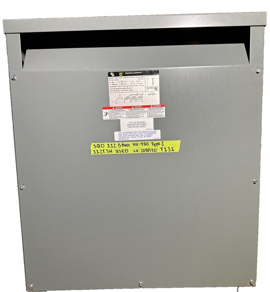 112.5KVA SQD 112T3H Transformer Pri 480V Sec 208/120V 3PH Type 2 Encl