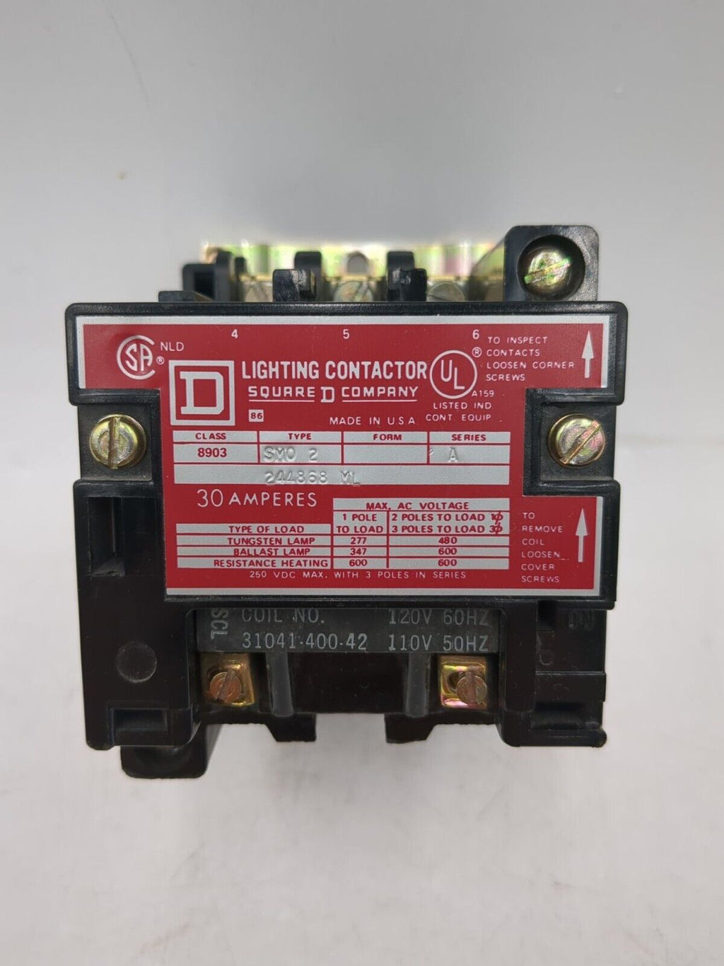 Square D 8903SMO2, 30 Amp, 600 Vac, Coil No. 31041-400-42, Lighting Contactor