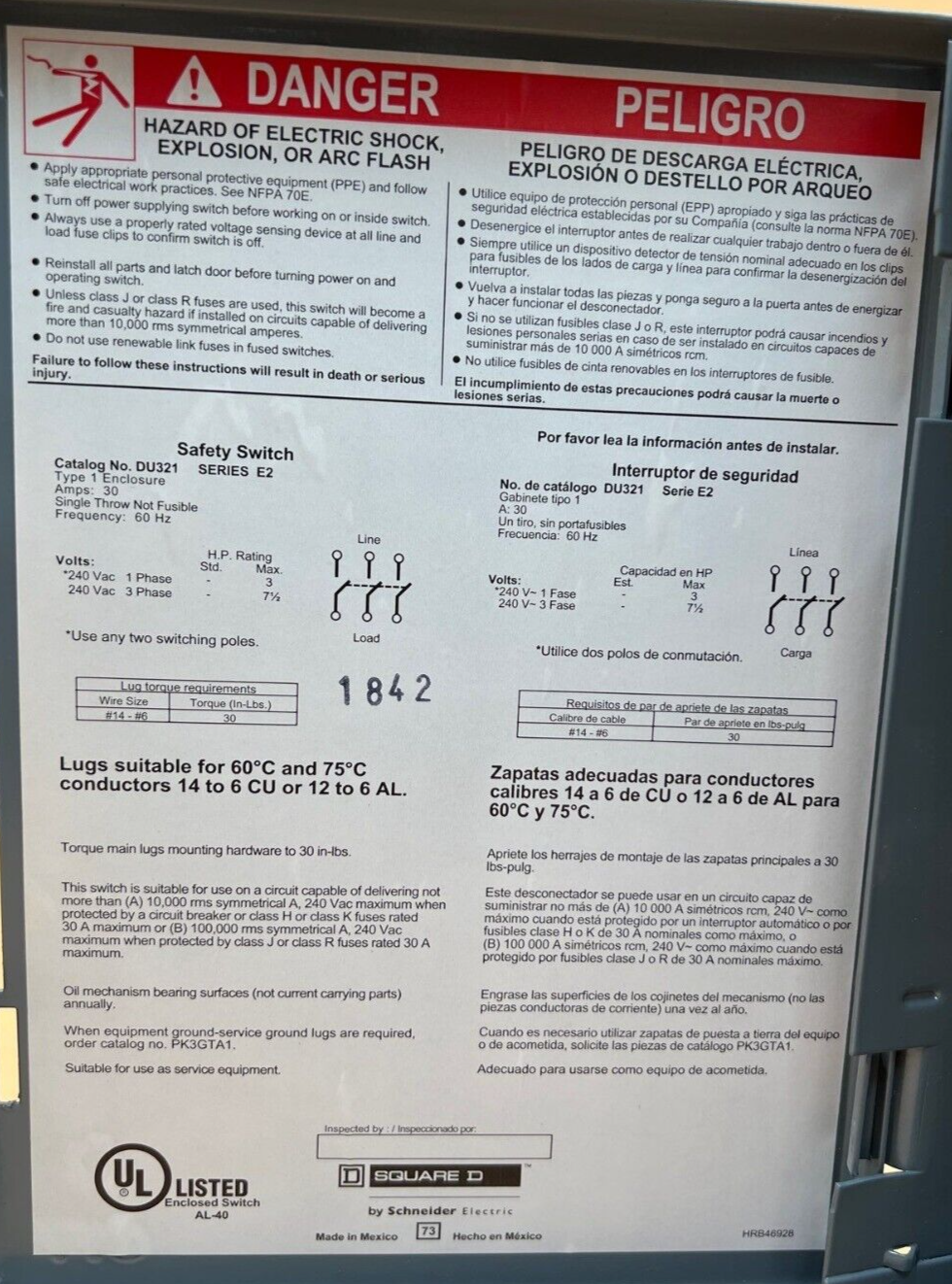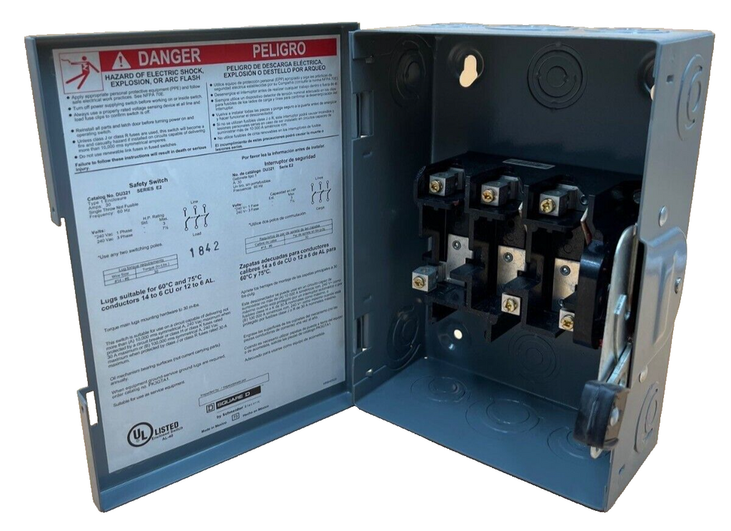 SQD DU321 Safety Disconnect Switch 30A 3P 240V Type 1 Indoor Enclosure