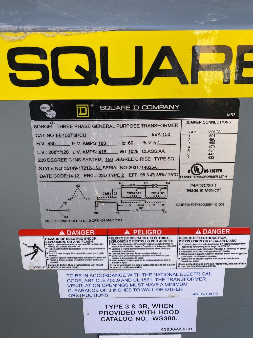 150KVA Square D EE150T3HCU Transformer Pri 480V Sec 208/120V 3PH Type 2 Encl Weight: 1029lb T230