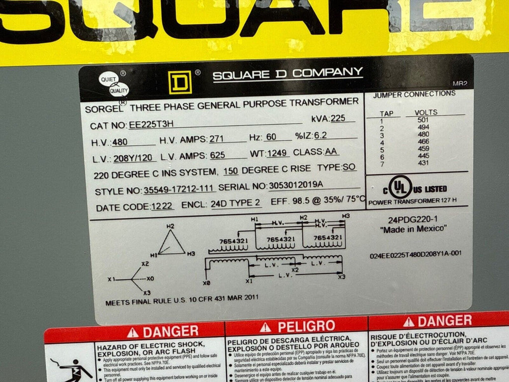 225 KVA Square D EE225T3H Transformer Pri 480V Sec 208/120V 3PH Indoor Encl Weight: 1249lbs