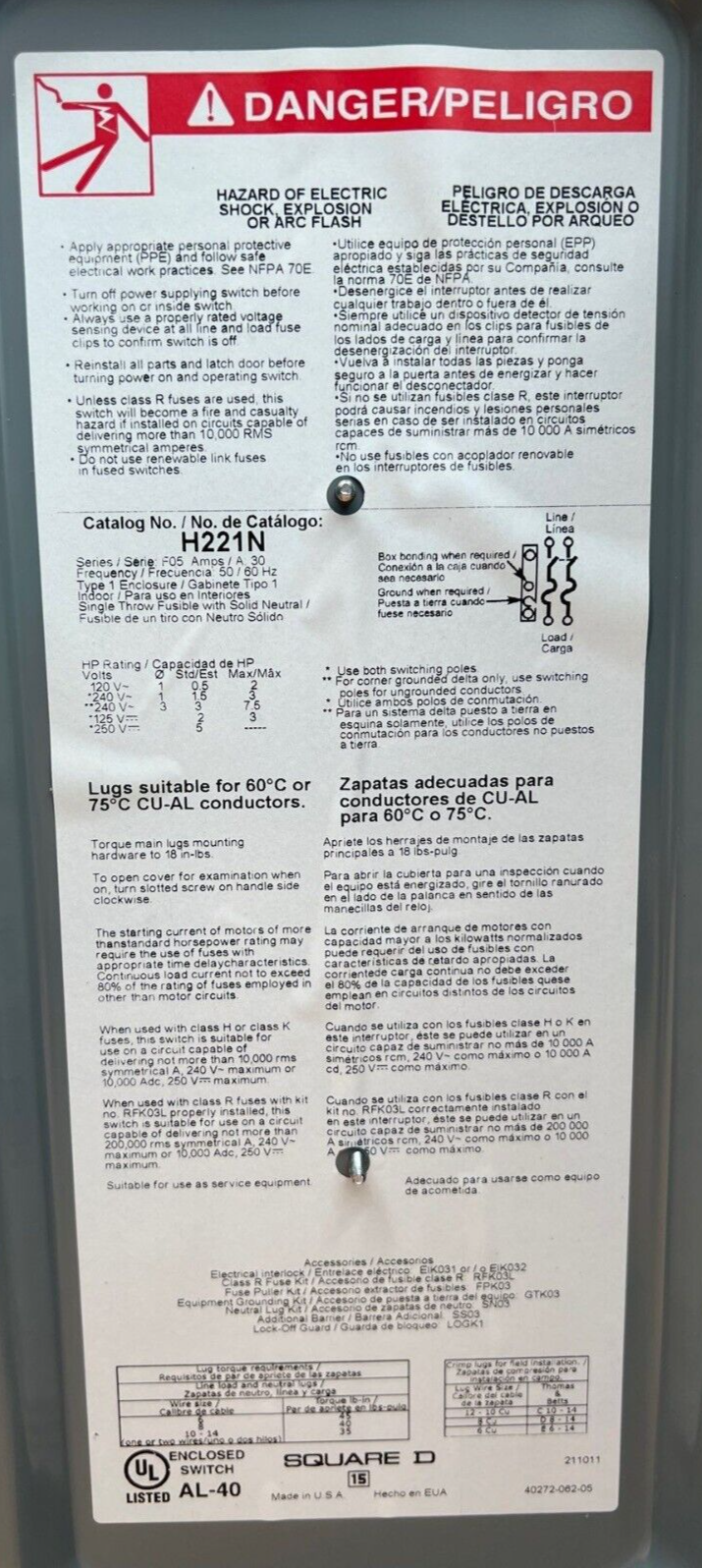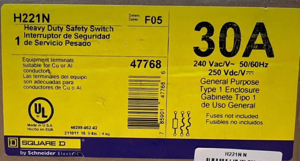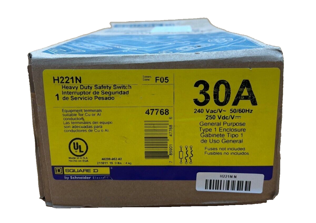 SQD H221N Safety Disconnect Switch 30A 2P 240V Type 1 Indoor Enclosure