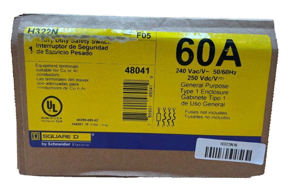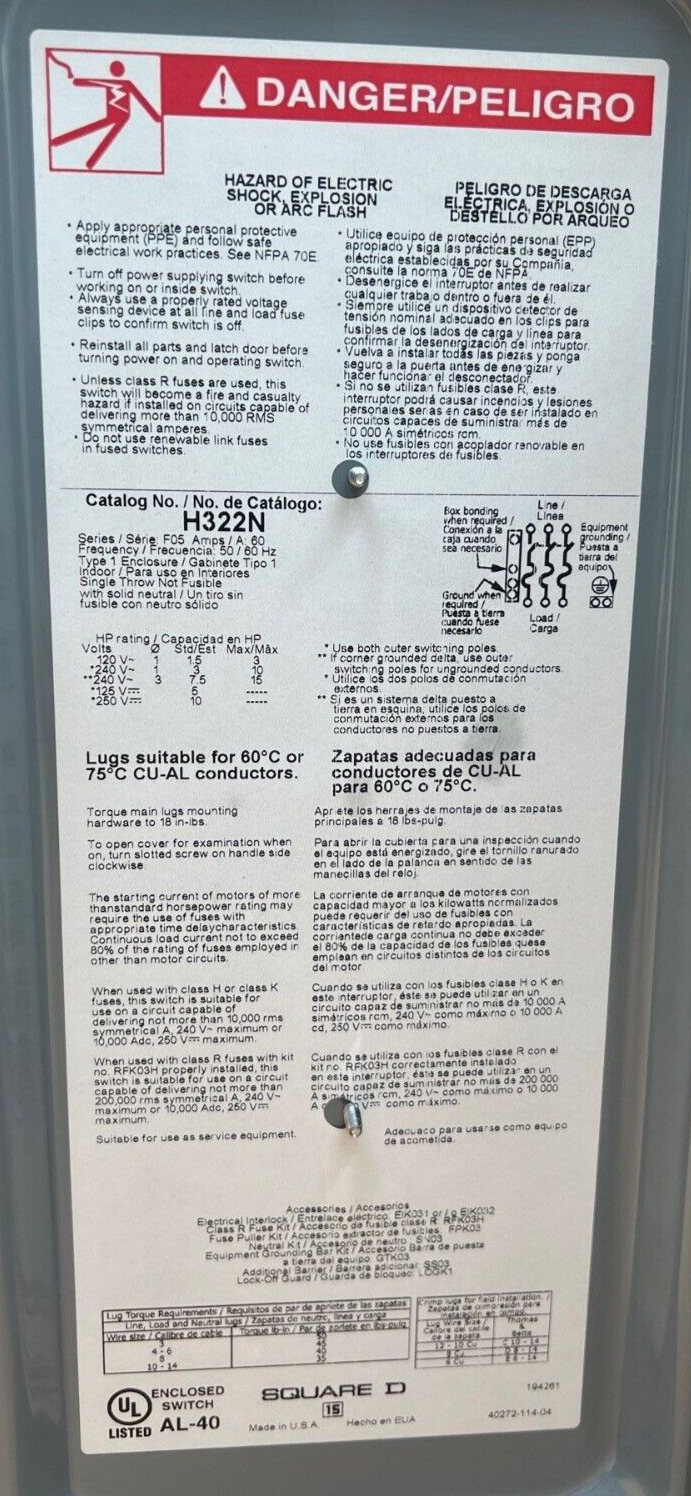 Square D H322N, 60 Amp, 240 Vac, Heavy Duty Safety Switch,