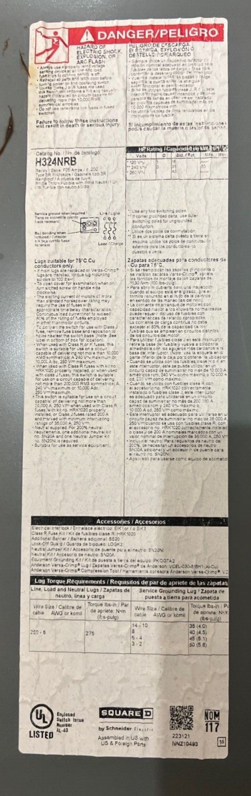 SQD H324NRB Safety Disconnect Switch 200A 3P 240V 3R Outdoor Enclosure