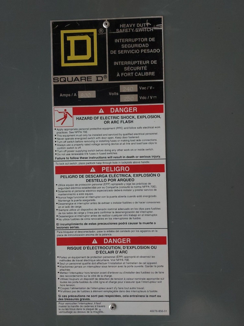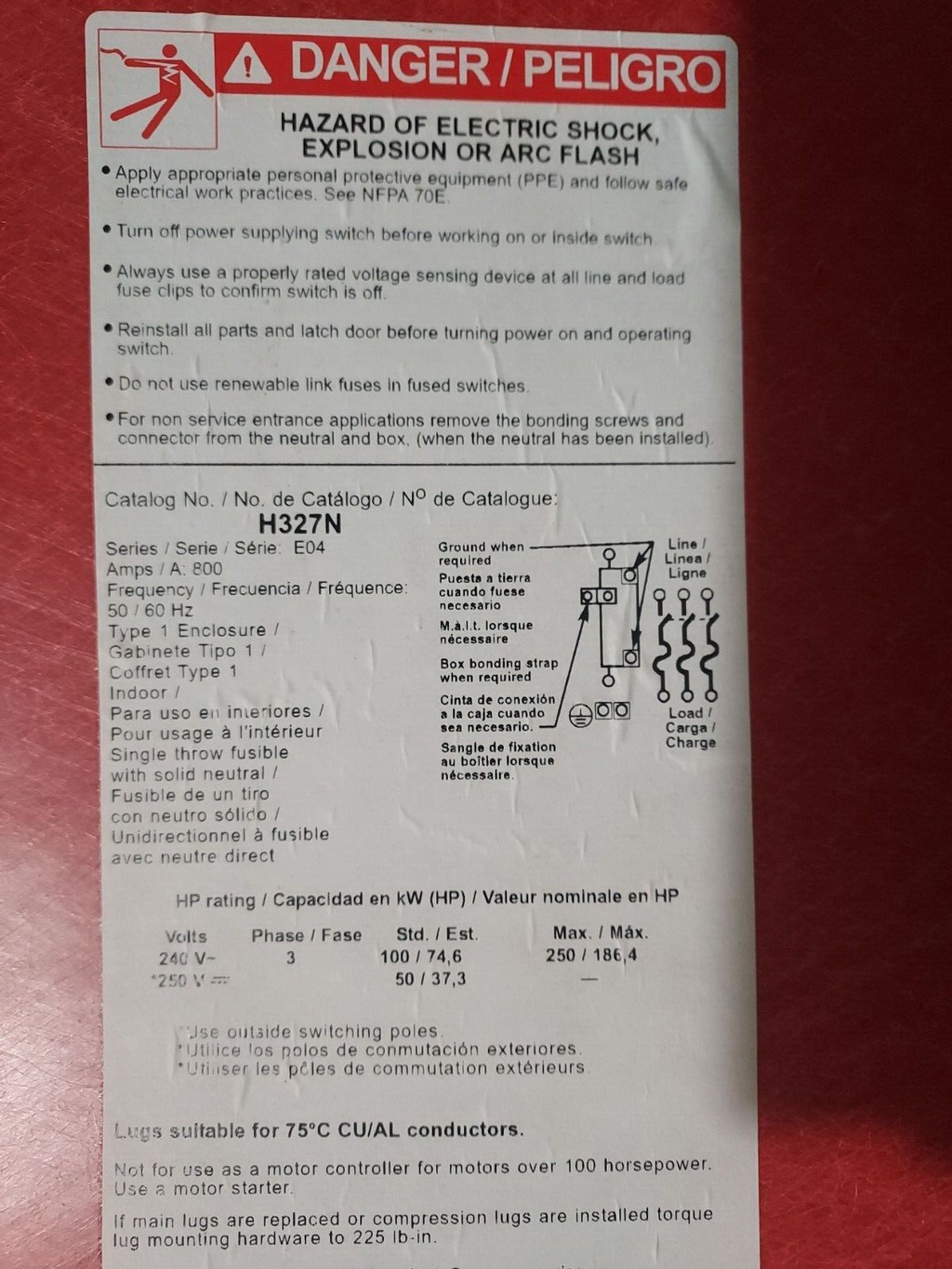 Square D H327N, NEMA Type 1, 800 Amp, 240V, Fusible, Heavy Duty Safety Switch Please message for a freight quote if needed. PLEASE MESSAGE FOR A SHIPPING QUOTE PRIOR TO PURCHASING. SHIPPING IS NOT INCLUDED IN THE PURCHASE OF THIS ITEM. Expedited services- An additional fee of 20% will be added to the shipping for this service. This will put your order at the top of the to do list. Please reach out BEFORE purchasing if you need this service.