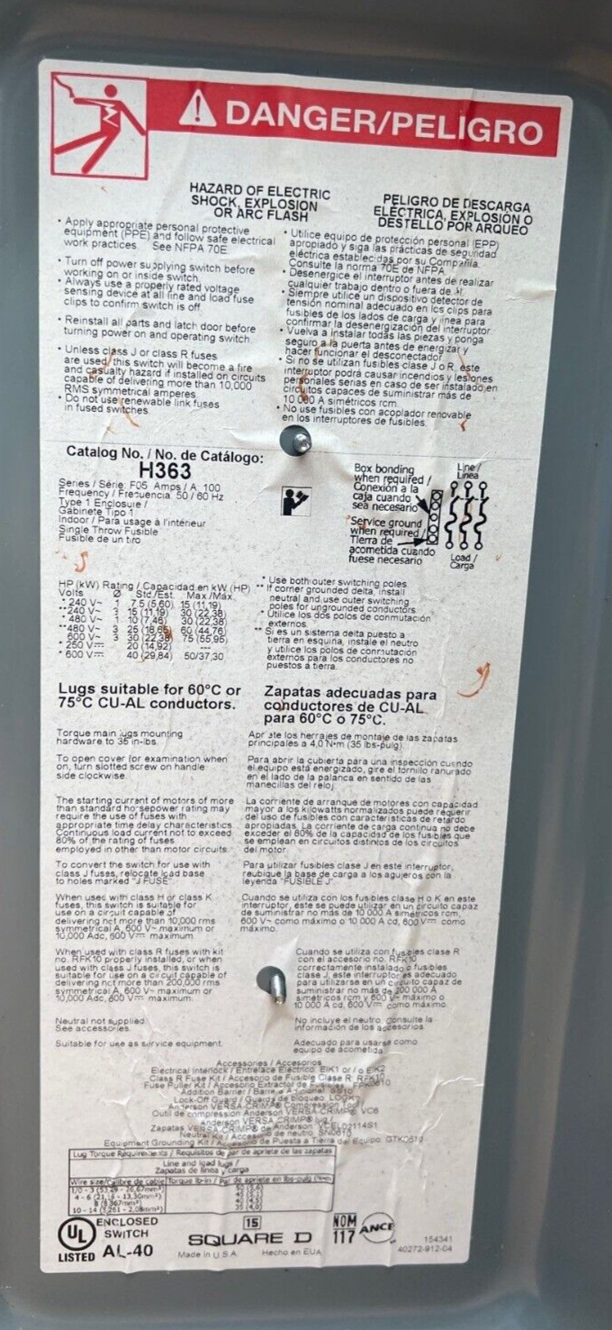 Square D H363, 100 Amp, 600 Volt, Type 1, Heavy Duty Safety Switch