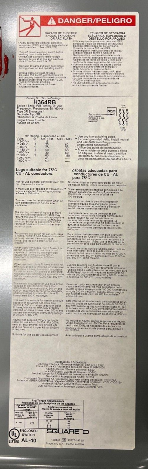 SQD H364RB Safety Disconnect Switch 200A 3P 600V 3R Outdoor Enclosure