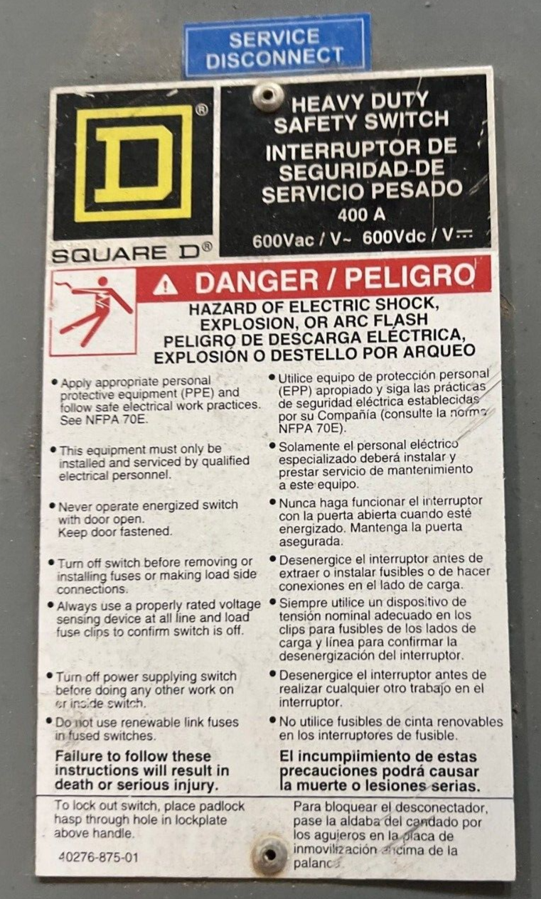 SQD H365NR Safety Disconnect Switch 400A 3P 600V 3R Outdoor Enclosure