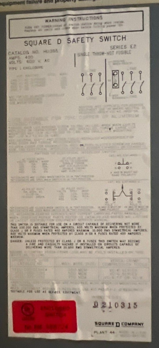 SQD HU365 Safety Disconnect Switch 400A 3P 600V Type 1 Indoor Enclosure