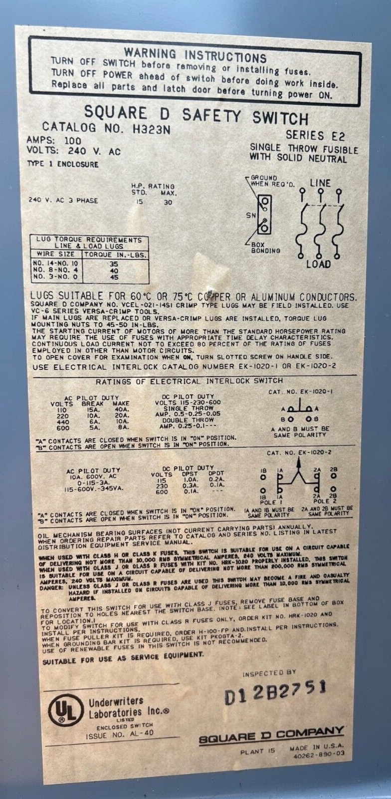 SQD H323N Safety Disconnect Switch 100A 3P 240V Type 1 Indoor Enclosure