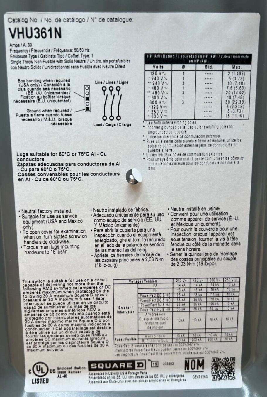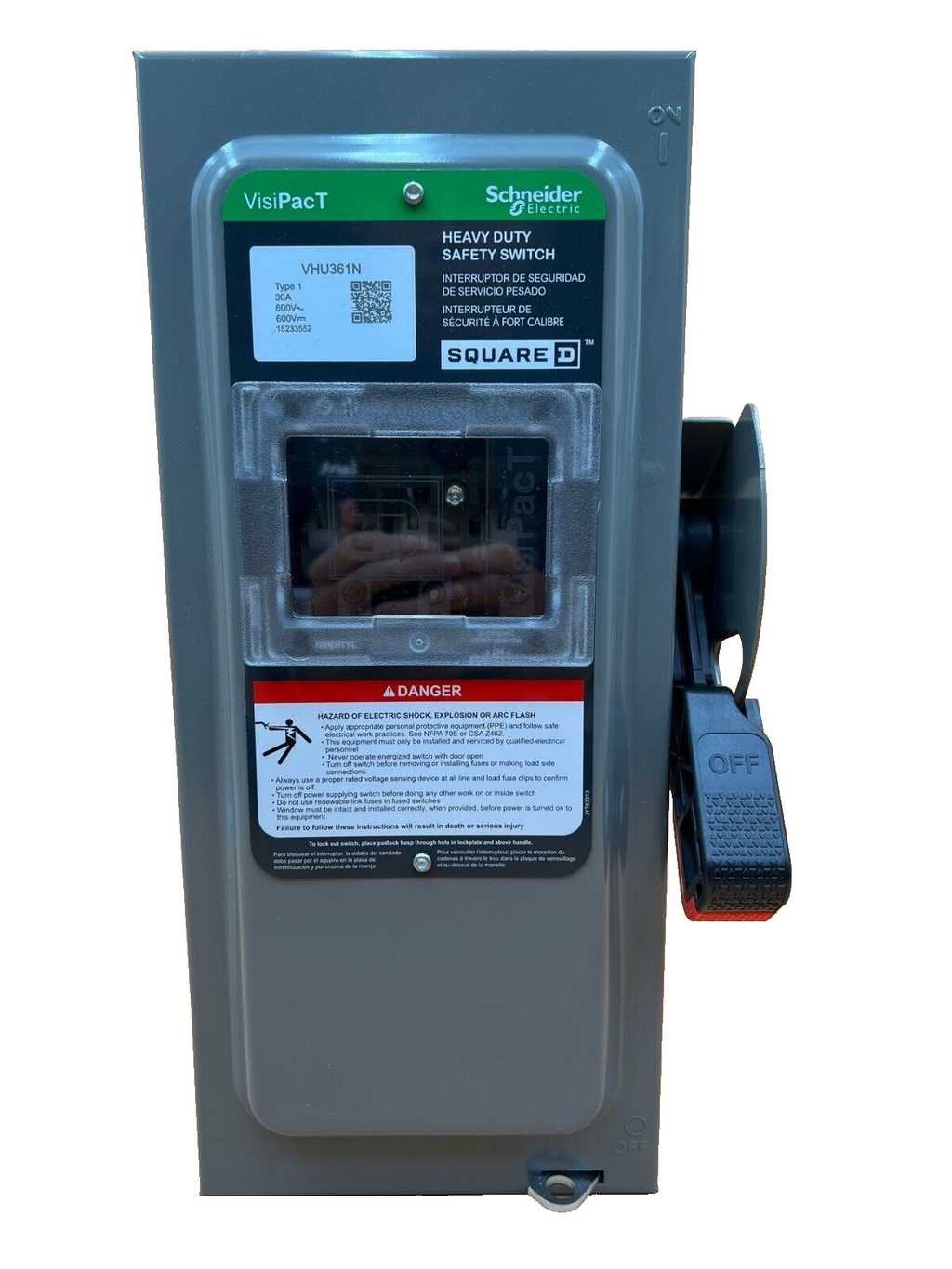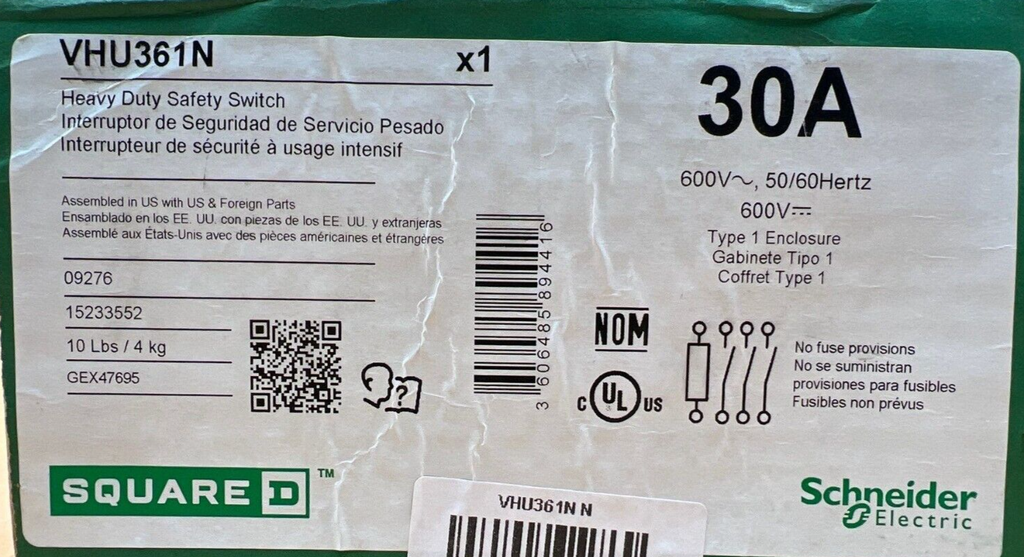 SQD VHU361N Safety Disconnect Switch 30A 3P 600V Type 1 Indoor Enclosure