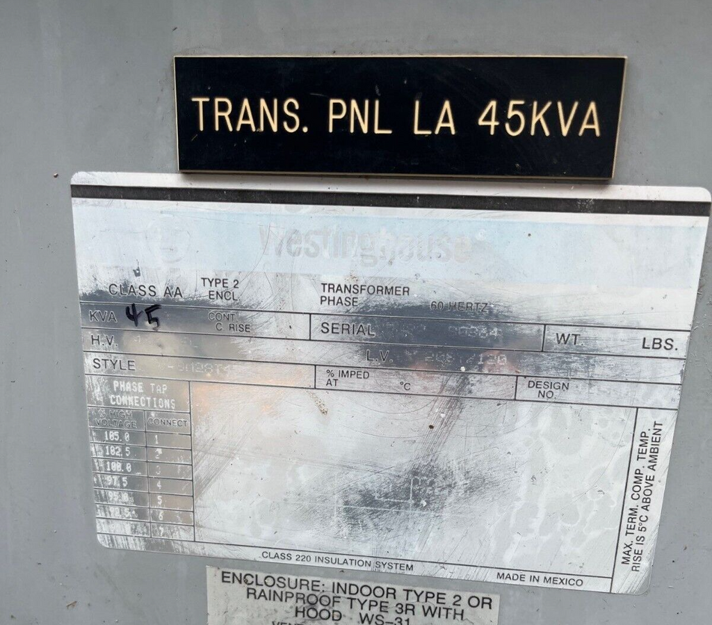 45KVA Westinghouse Transformer Pri 480V Sec 208/120V 3 Phase Outdoor Weight: 410lb
