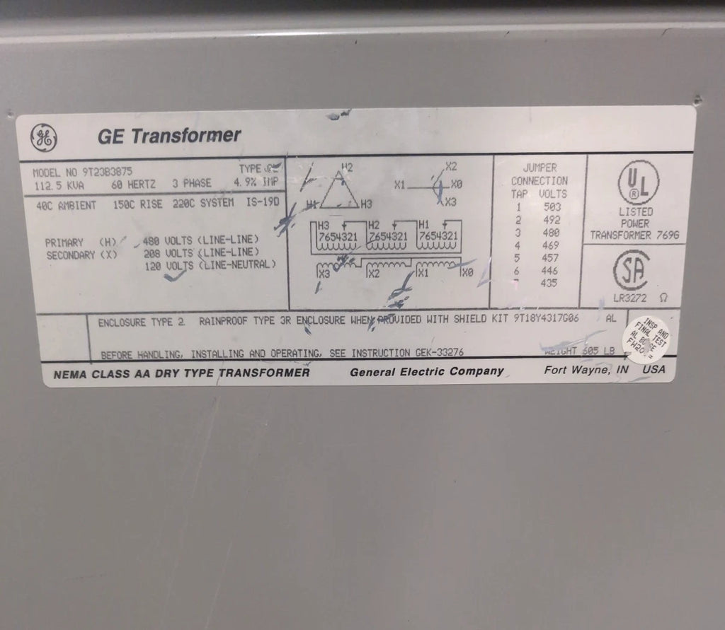 112.5KVA GE 9T23B3875 Transformer Pri 480V Sec 208/120V 3PH Indoor Encl Type QL
