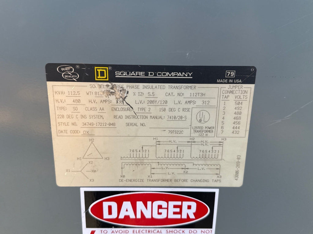 112.5KVA Square D 112T3H Transformer Pri 480V Sec 208/120V 3PH Type 2 Encl