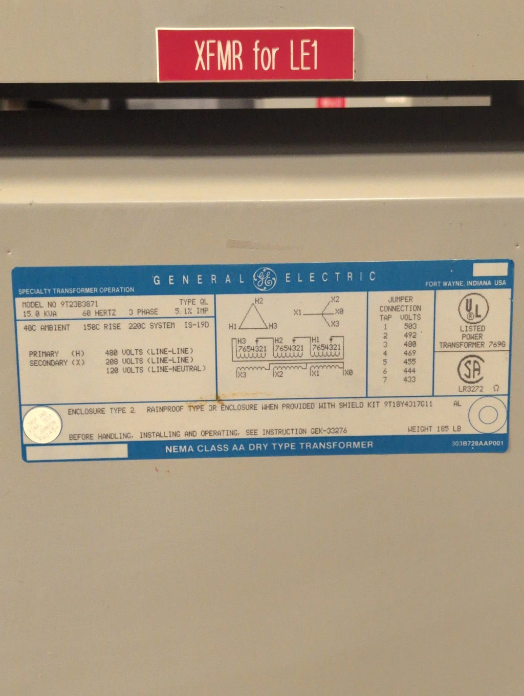 15KVA GE 9T23B3871 Transformer Pri 480V Sec 208/120V 3PH Type 2 Encl Indoor 60Hz