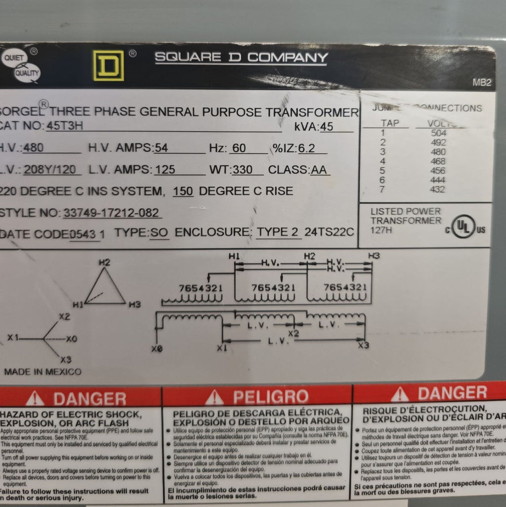 45kVA Square D 45T3H Sorgel Transformer 3PH Pri 480V Sec 208/120V T266