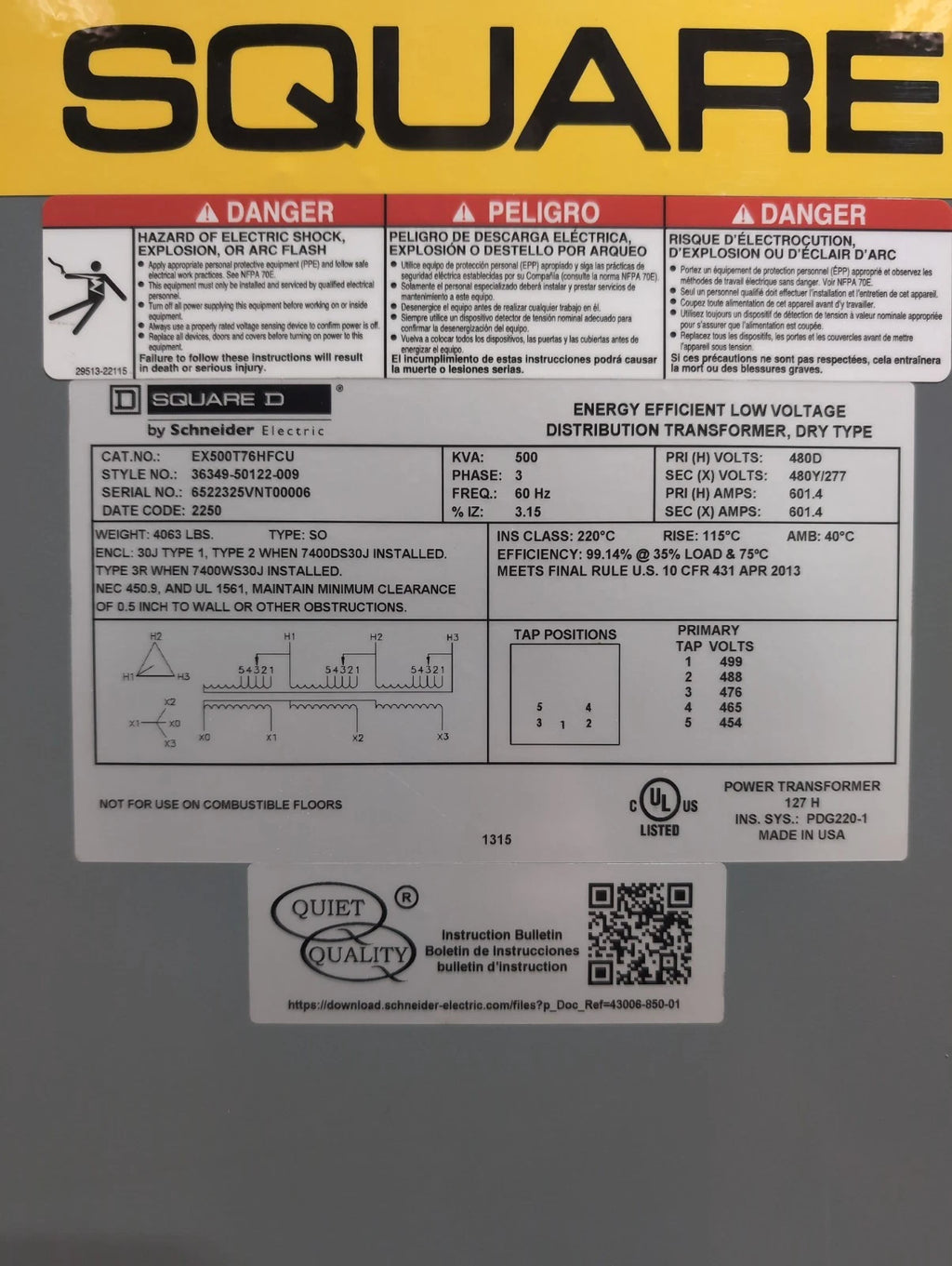 500 kVA Square D EX500T76HFCU Transformer Pri 480V Sec 480/277V 3PH 60Hz Type SO New