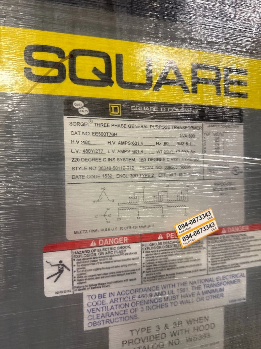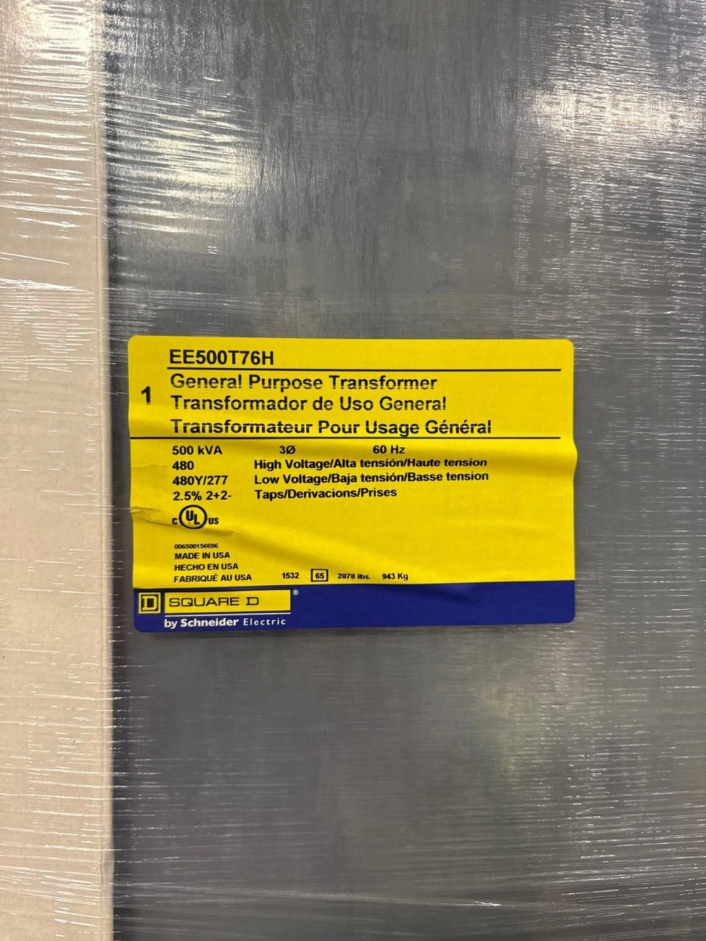 500KVA Square D EE500T76H Transformer Pri 480V Sec 480/277V 3PH Indoor Encl