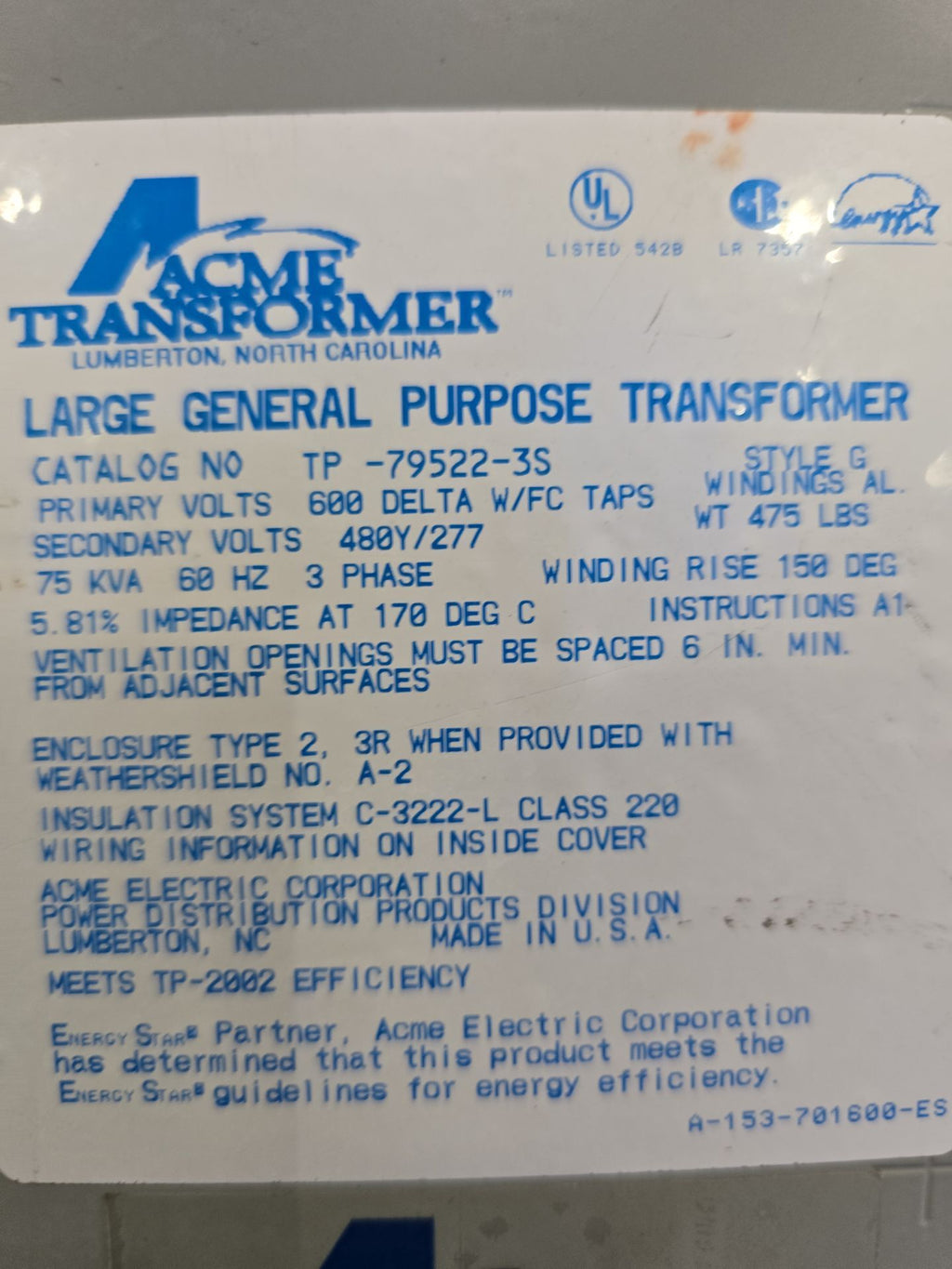 75kVA ACME TP-79522-3S Transformer Pri 600V Sec 480/277V 3PH Encl Type 2