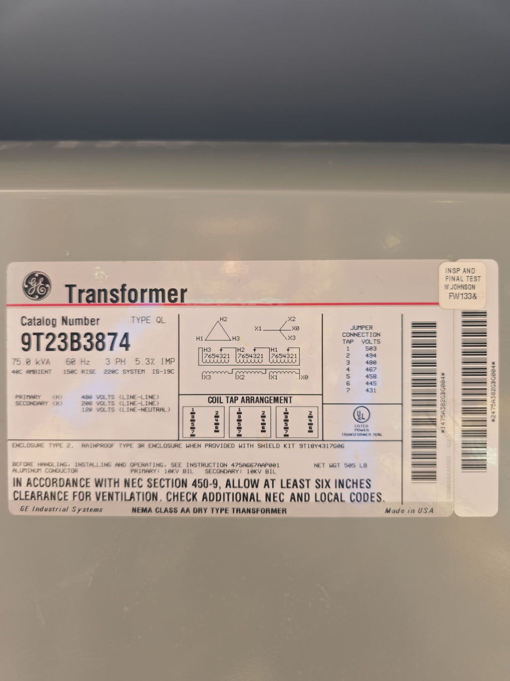 75KVA GE 9T23B3874 Transformer Pri 480V Sec 208/120V 3PH Indoor Encl Type QL