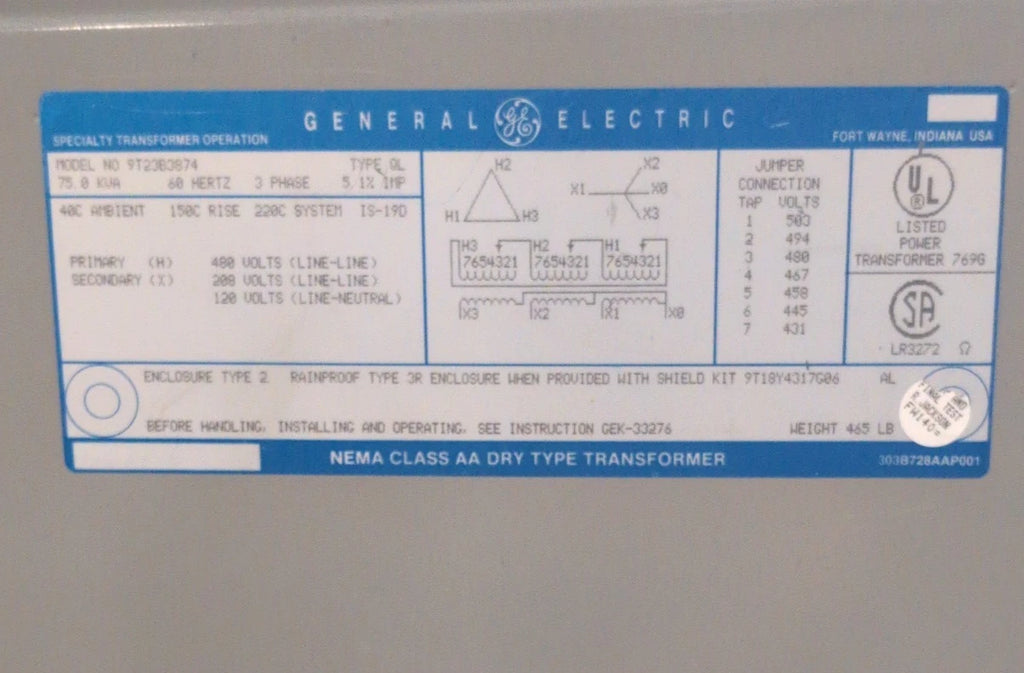 75KVA GE 9T23B3874 Transformer Pri 480V Sec 208/120V 3PH Indoor Encl Type QL