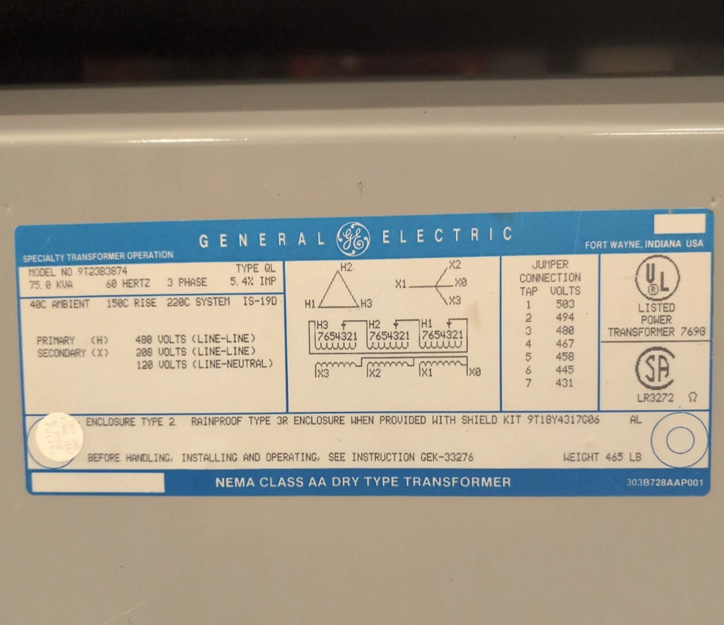 75KVA GE 9T23B3874 Transformer Pri 480V Sec 208/120V 3PH Indoor Encl Type QL