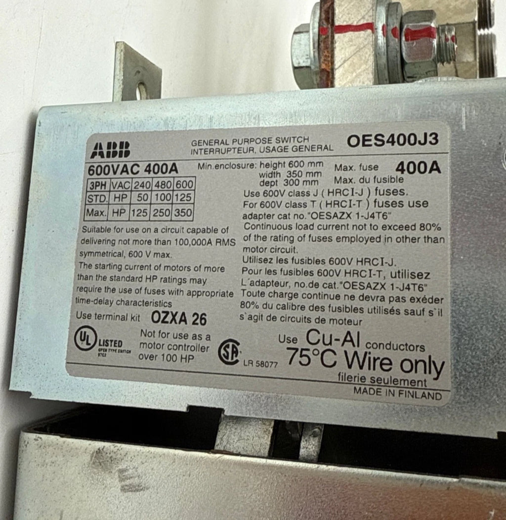 ABB OES400J3 Fused Disconnect Switch 400A 3P 600V 3PH 350HP 400 Amp 3 Pole