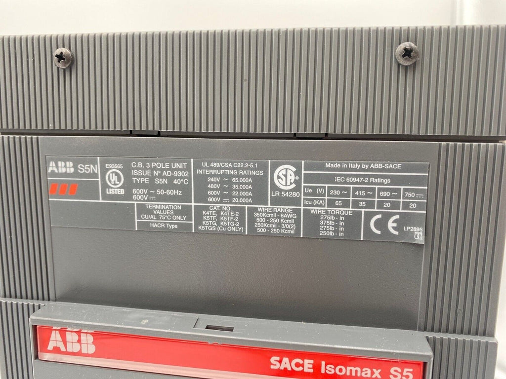 ABB S5N400 Circuit Breaker 400A 3P 600V 3PH SACE Isomax S5 400 Amp 3 Pole S5N Condition Notes: With mounting accessory, cradle tray