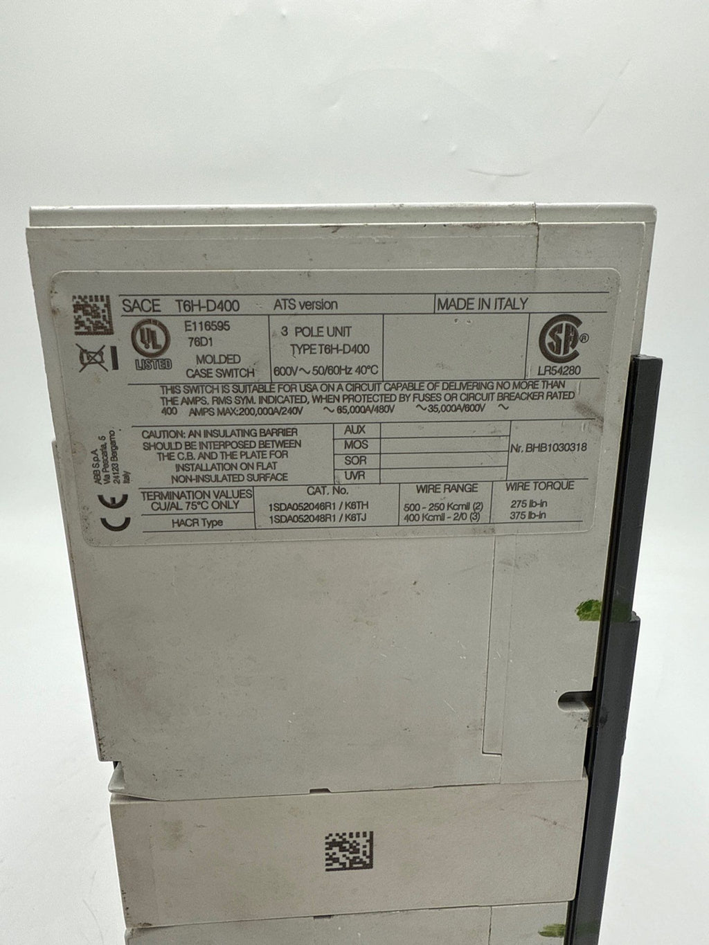 ABB T6HD400 Circuit Breaker 400A 3P 600 V T6H SACE 400 Amp 3 Pole
