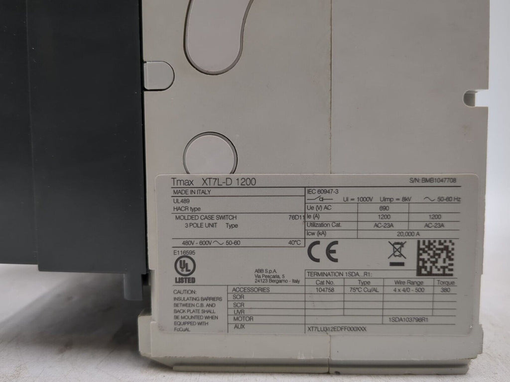 ABB XT7 L-D 1200, 3 Pole, 1200 Amp, 600 Volt, Circuit Breaker, NOB