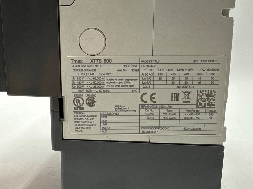 ABB XT7SU380CFFF000XXX Circuit Breaker 800A 3P 600V Ekip Dip LSI XT7S 800