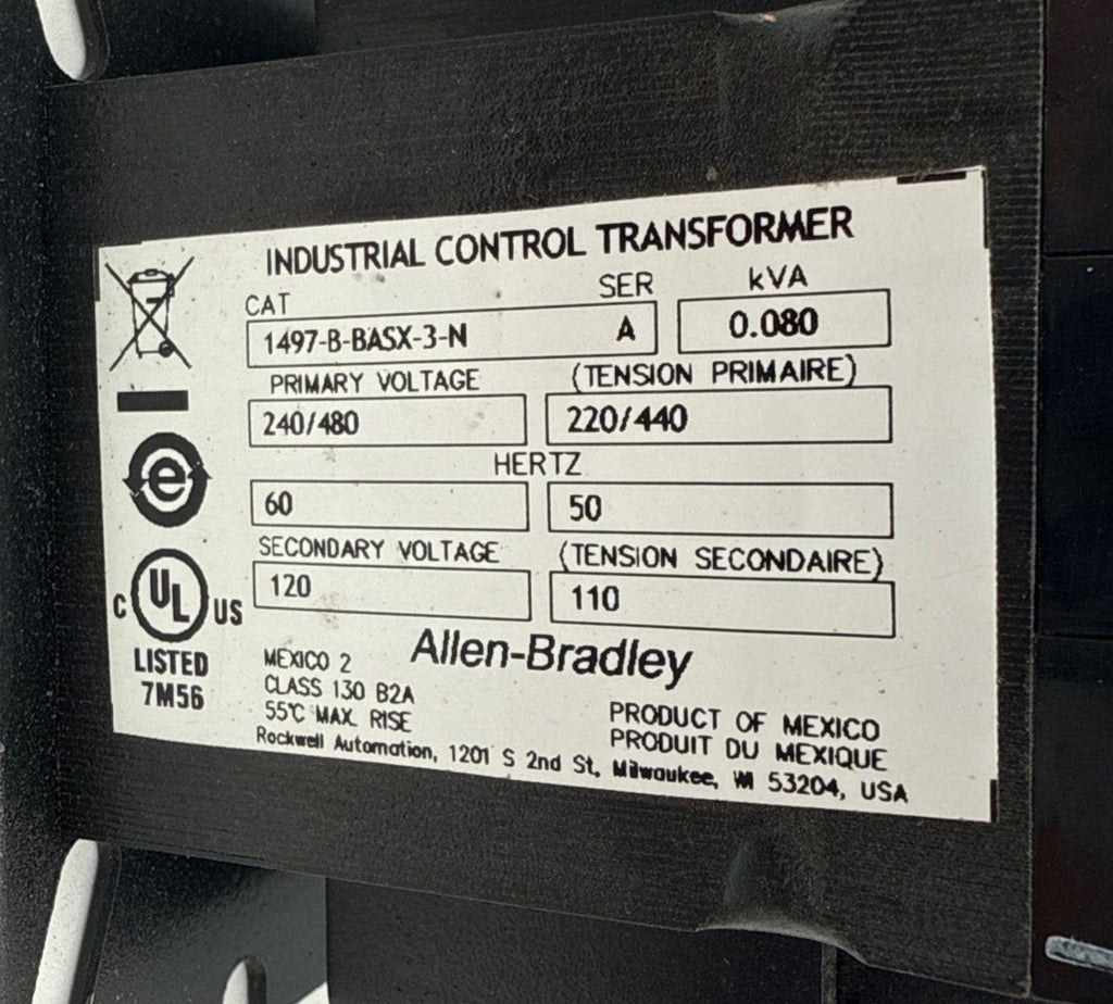 Allen Bradley 1497-B-BASX-3-N Control Power Transformer 0.080kVA Pri 240/480V Sec 120V