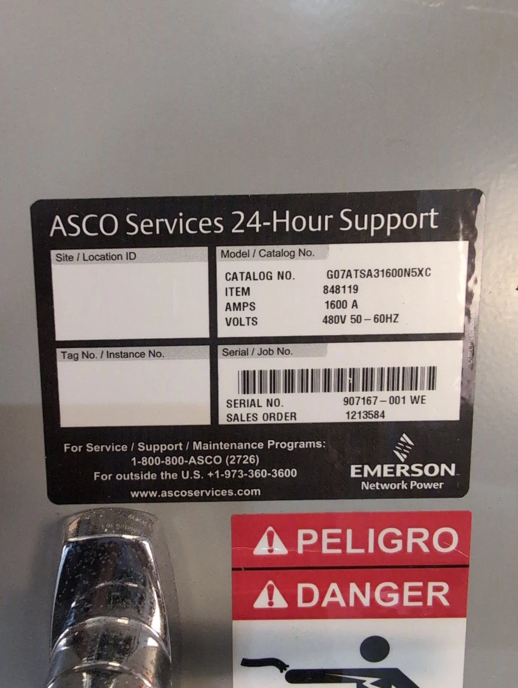 ASCO 7000 Series Automatic Transfer Switch 1600A 480V 3PH 3P G07ATSA31600N5XC 50-60Hz