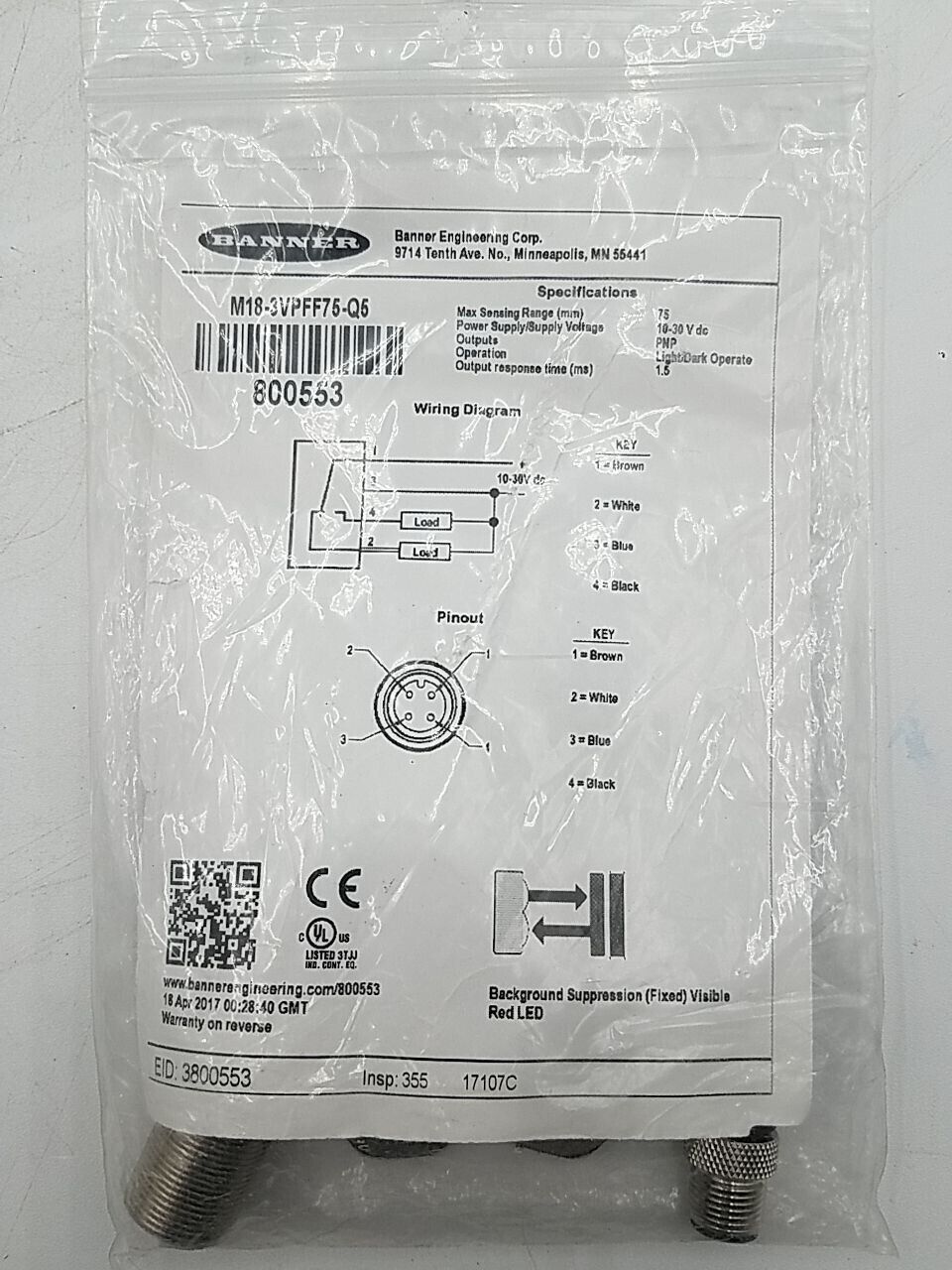M18-3VPFF75-Q5 BANNER ENGINEERING 800553 - M18-3 SERIES: NICKEL-PLATED BRASS: FIXED FIELD; RANGE: 75 MM; INPUT 10-30 V DC; OUTPUTS: COMPLEMENTARY PNP; CONNECTION: 4-PIN M12 150 MM PVC PIGTAIL Never