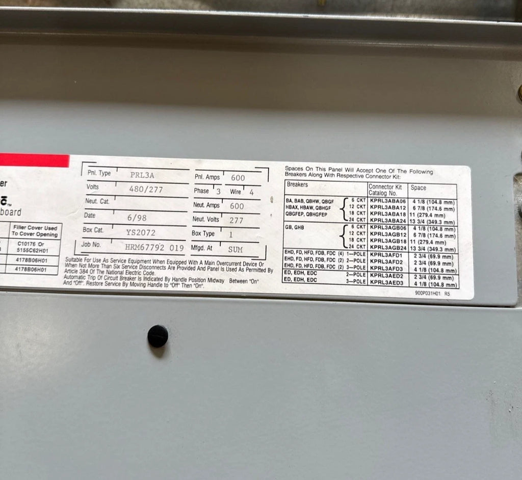 CH PRL3A Panelboard 600A 480/277V 3PH 600 Amp Indoor YS2072 MLO Panel Main Lug