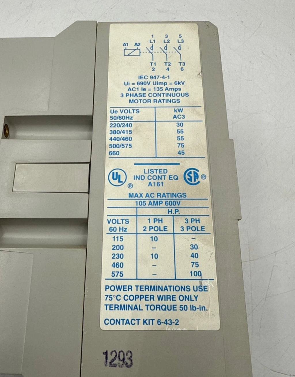 Cutler Hammer CE15MN3 Contactor 105A 3P 600V 3PH 100HP Max Coil 110/120V