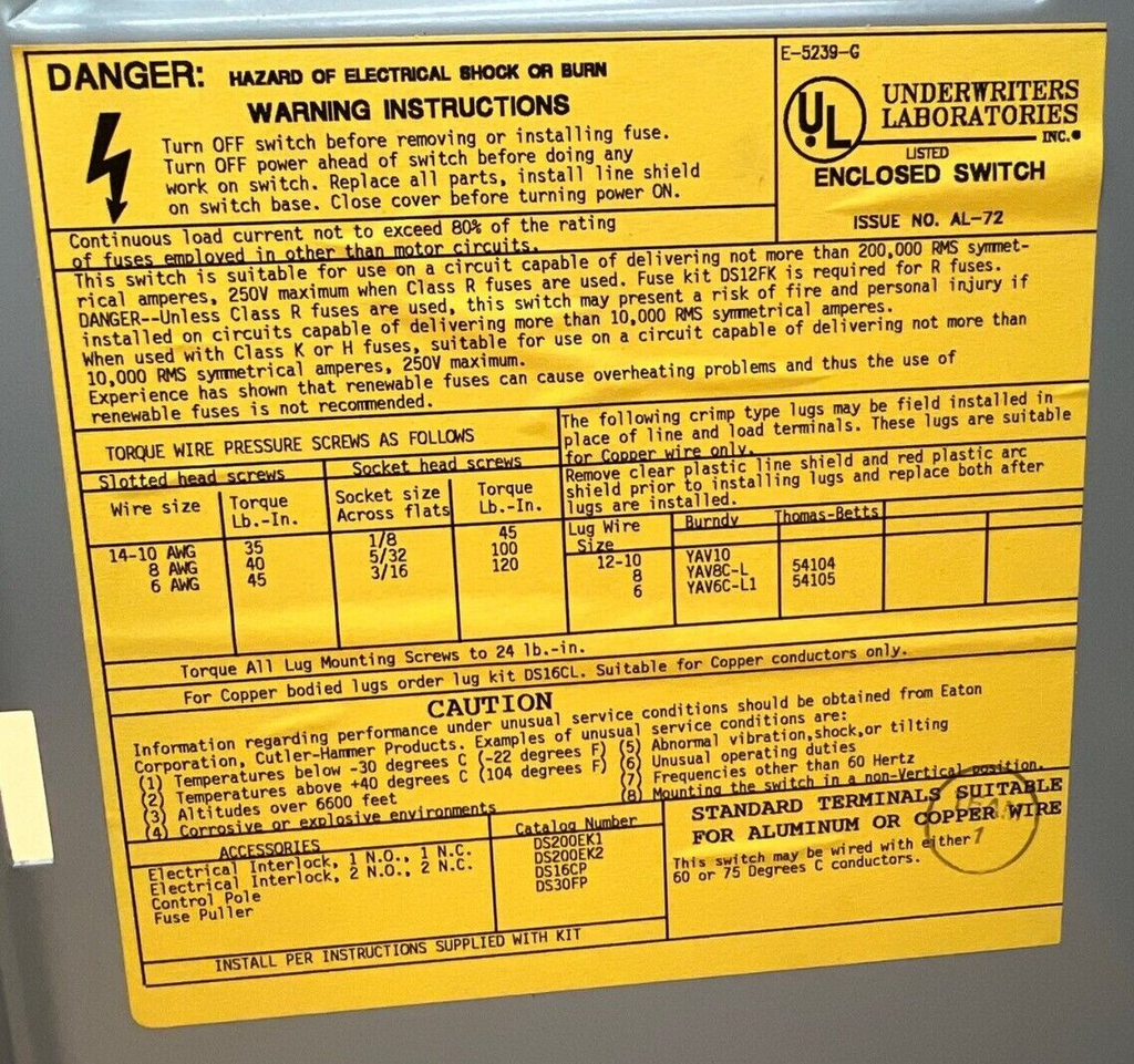 Cutler Hammer DH221NRK Safety Disconnect Switch 30A 2P 240V 3R Enclosure Outdoor