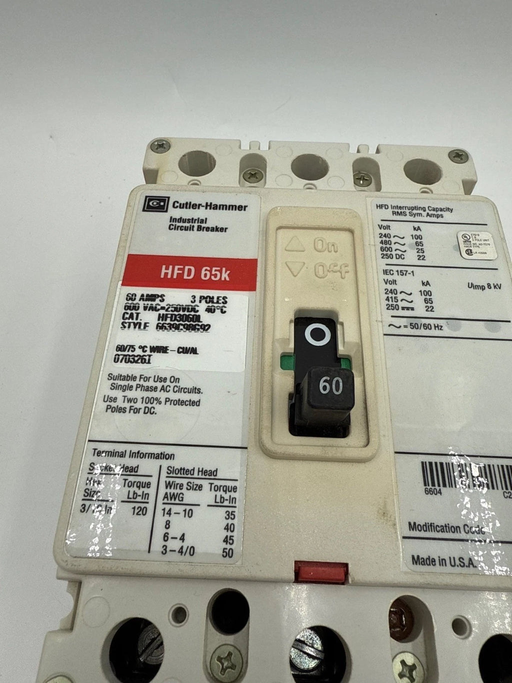 Cutler-Hammer HFD3060L Circuit Breaker 60A 3P 600V HF 65k 60 Amp 3 Pole